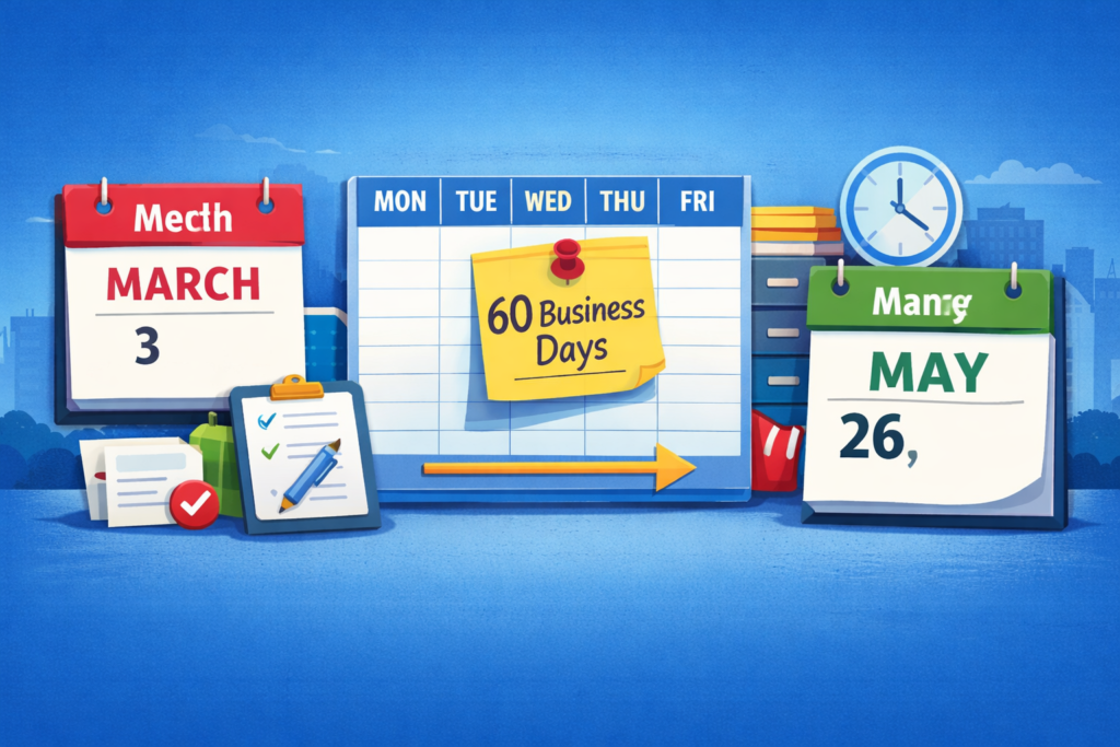 The tricky part is that business days don’t work the same way as regular calendar days. Weekends don’t count, and depending on the situation, public holidays may not count either. That means 60 business days can land weeks later than you might initially assume.